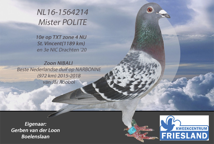 Gerben had 4 duiven mee op deze zeer zware vlucht en de zoon van NIBALI die op St. Vincent ook zijn eerste duif was en teletekst speelde, was nu ook weer zijn eerste duif. Hij was 10e van NIC Drachten en 27e zone 4 NU. De zus van SONJA en pure Hagens, de 16-4283208 speelde 16e van het NIC.