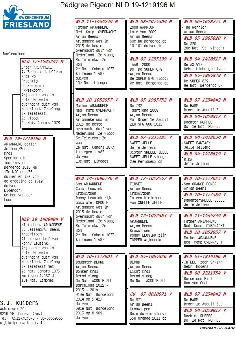 Gerben had een jaarling doffer voorop die familieteelt is op ARJANNEKE van Ronnie Leusink. ARJANNEKE was in 2015 de beste duif van Nederland en komt uit duiven van Arjan Beens en Jelle Jellema. Ze vloog 3x Teletekst met: