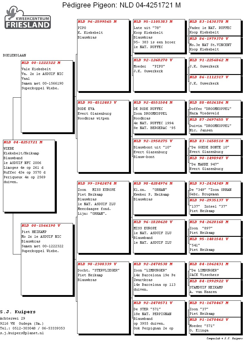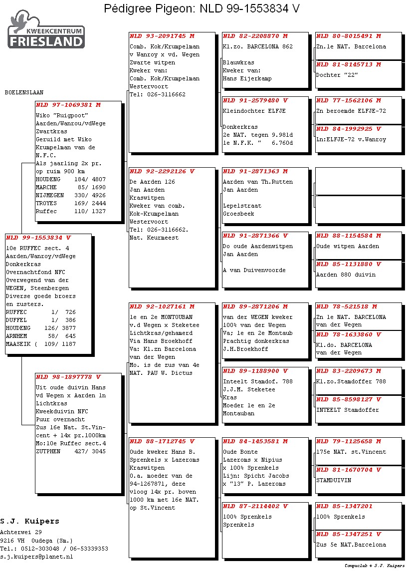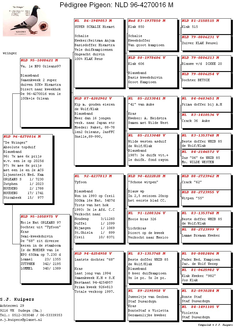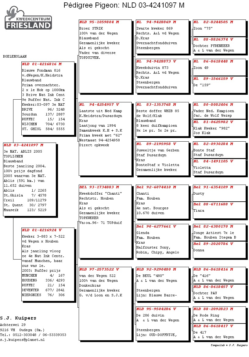 De vader is de “Blauwe Fondman 816” , een prima fonddoffer. Hij vloog 2 x 1e van het hok op 1000 km waarvan: 3e Brive Nat. Ink Centrum Drachten. 9e Ruffec Nat. Ink Centrum Drachten. Hij is vader van o.a.: 03-097, de 3e NAT ABLIS, 04-090 etc. De vader van de “816” is een zuivere A & L van der Wegen uit de Lijn: Oud Doffertje (2x) x Barcelona x De 61x Kruisborst x Zoon 783 x de 12 x Zus Schift. De moeder van de “816” komt uit een zuivere duivin van Staf Dusarduijn te Groede keer de beroemde “68” van Klaas Heidstra uit Drachten. De 1983-1353768 was in 1985 NEDERLANDS KAMPIOEN W.H.Z.B. Deze doffer vloog: 9x 1e prijs, 5x 2e prijs en 2x 3e prijs in het rayon. Dit zonder dubbelingen. Hij werd in zijn carrière 8 keer duifkampioen. Verder ontpopte deze doffer zich als een SUPER VERERVER. Auke Heidstra, de zoon van Klaas bouwde met een dochter uit de “68” ( het “Wilde Westen”) zijn hok op en Simon Kuipers (schoonzoon) bouwde met een dochter uit het “Wilde Westen”, de “Kip met de Gouden Eieren” zijn kolonie op. Zo wonnen kinderen en kleinkinderen uit deze “68” lijn 6 keer een 1e NATIONAAL in de sector sinds 1990, van 600 km tot /met 1200 km (Orleans, Troyes, Brive, St. Vincent). Daarnaast vlogen diverse duiven bij de 1e tien in de sector, dit gepresteerd op verschillende hokken. Ook stamt de 1e NAT. ASDUIF DAGFOND NPO 2000 van Simon Kuipers uit de”68” lijn. De bloedlijn is: KLAK x J. de Wolf (nu al bijna een legende) uit Wezep.
