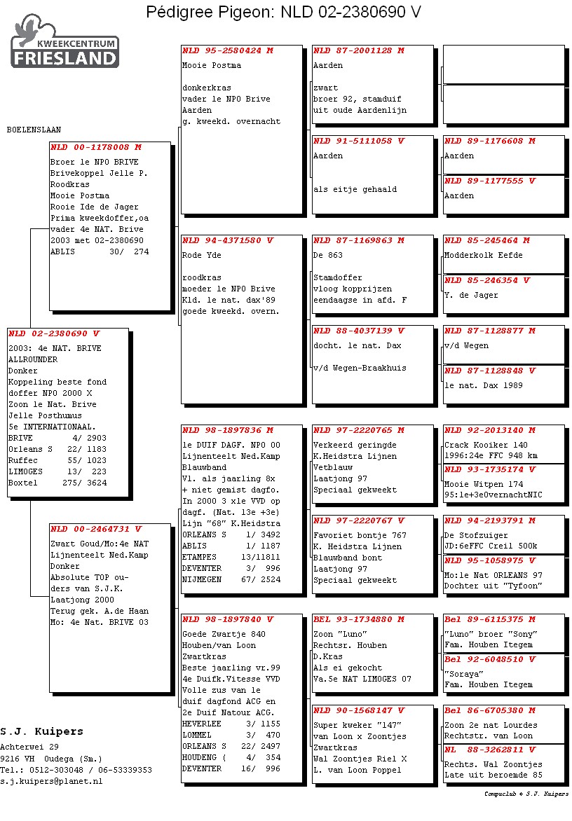 Deze duivin vloog in 2003 de 4e Nat. BRIVE ( 950 km) en de 5e INT. NAT. op 2905 duiven. Toen is er een jaar niet meegevlogen, alleen uit gekweekt. In 2005 weer mee gevlogen en won toen ze: Orleans (647 km) 22e op 1.183 duiven Ruffec (894 km) 55e op 1.023 duiven Limoges (874 km) 13e NIC Dachten op 223 duiven. Daarna definitief op de kweek gezet. De 02-2380690 komt uit de koppeling van de 1e NAT. ASDUIF Dagfond N.P.O. in 2000 keer een zoon uit de 1e Nat. Brive 1999 van Jelle Posthumus de Wilp.