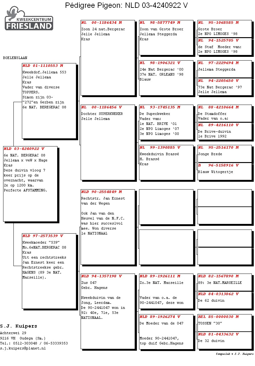 De moeder komt via de Jong uit Leerdam van een rechtstreeks Jan Ernest keer een rechtstreekse gebr. HAGENS uit de lijn van de “MARSEILLE”. Hij won 1989 de 3e NAT. Marseille, tevens vloog hij 1988 de 47e NAT LOURDES. De 1990-2441047 won in 1992: 40e, 71e, 53e NATIONAAL.