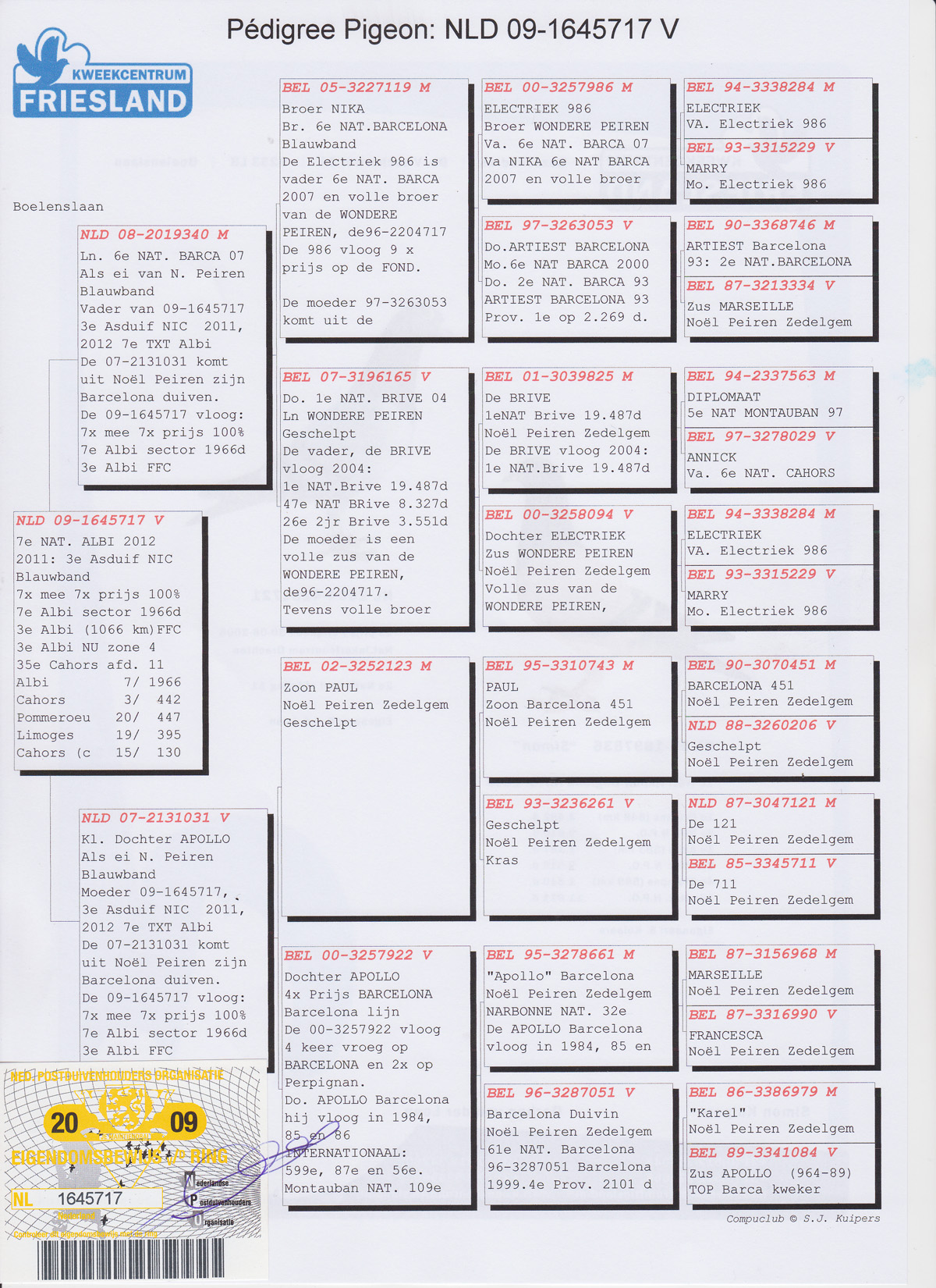 2009-1645717 “7e Nat. Albi 2012” 100% Noël Peiren duivin uit Zedelgem België. Ze vloog in totaal 7x mee op de meerdaagse fond en won ook 7x prijs. Ze was 3e Asduif van NIC Drachten in 2011.