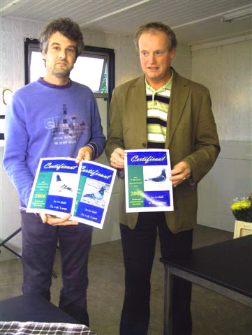 Een foto tijdens de prijsuitrijking NIC Drachten in 2006. Gerben en Simon hadden de eerste 3 duifkampioenen op de meerdaagse fond.